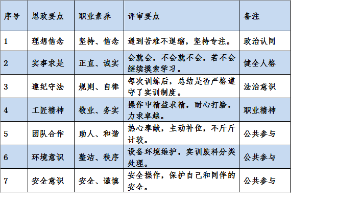 一、课程考核评价的方法机制建设 构建知识、能力与思政考核并重的“五化”考核评价体系:考核过程全程化、考核内容综合化、考核形式多样化、评价主体多元化、评分标准导向化。理论知识全程测试、项目任务综合评价、日常考核形式多样、企业导师精准评测、课程思政导向评价,强调“学中做”“做中学”“思政浸润”,加强学习过程管理,提高学习质量。 二、思政评价维度
