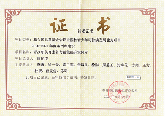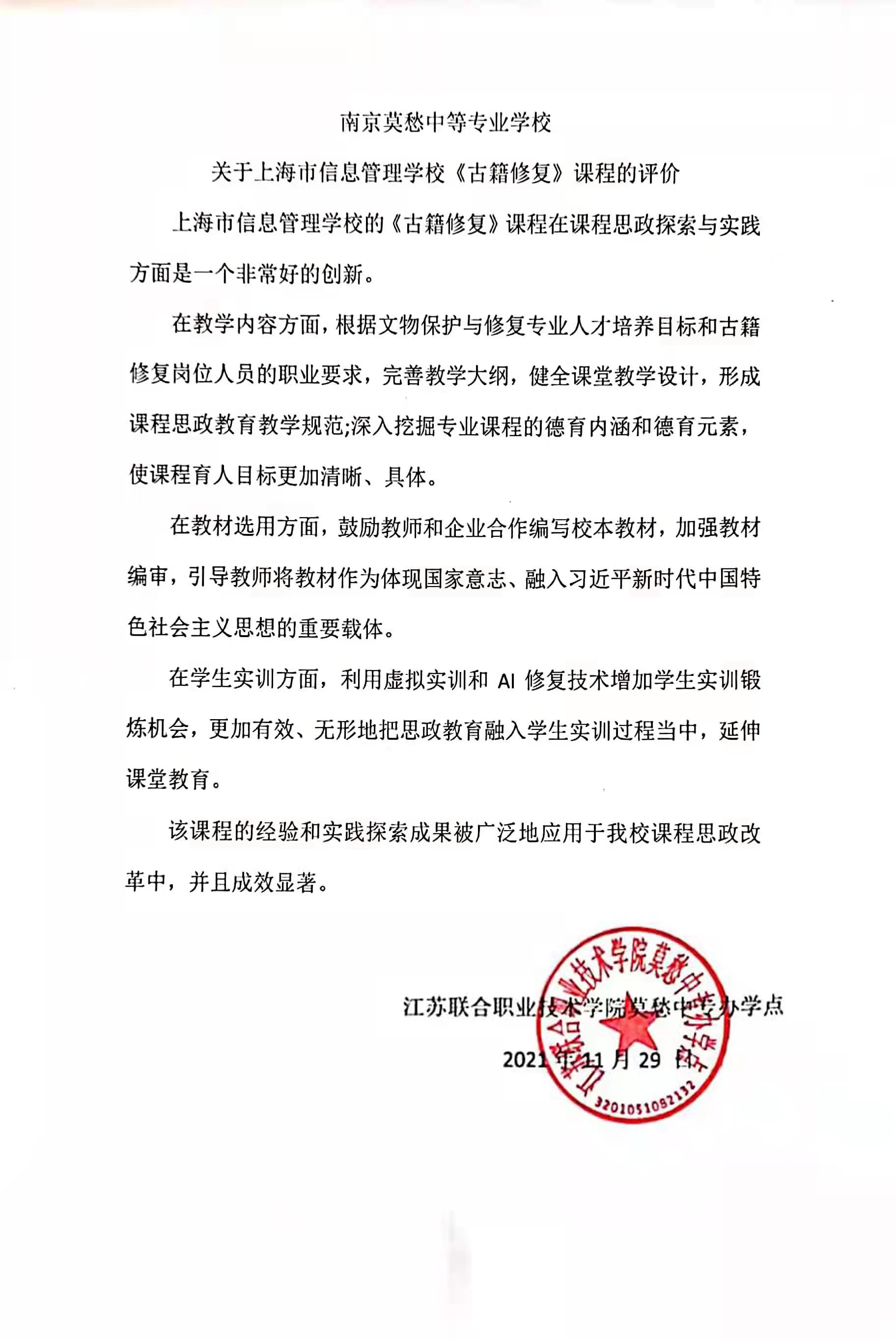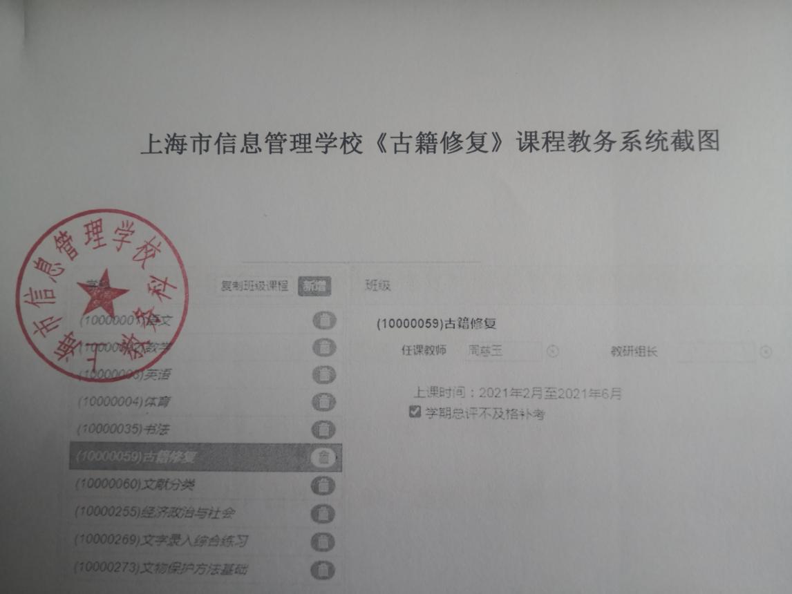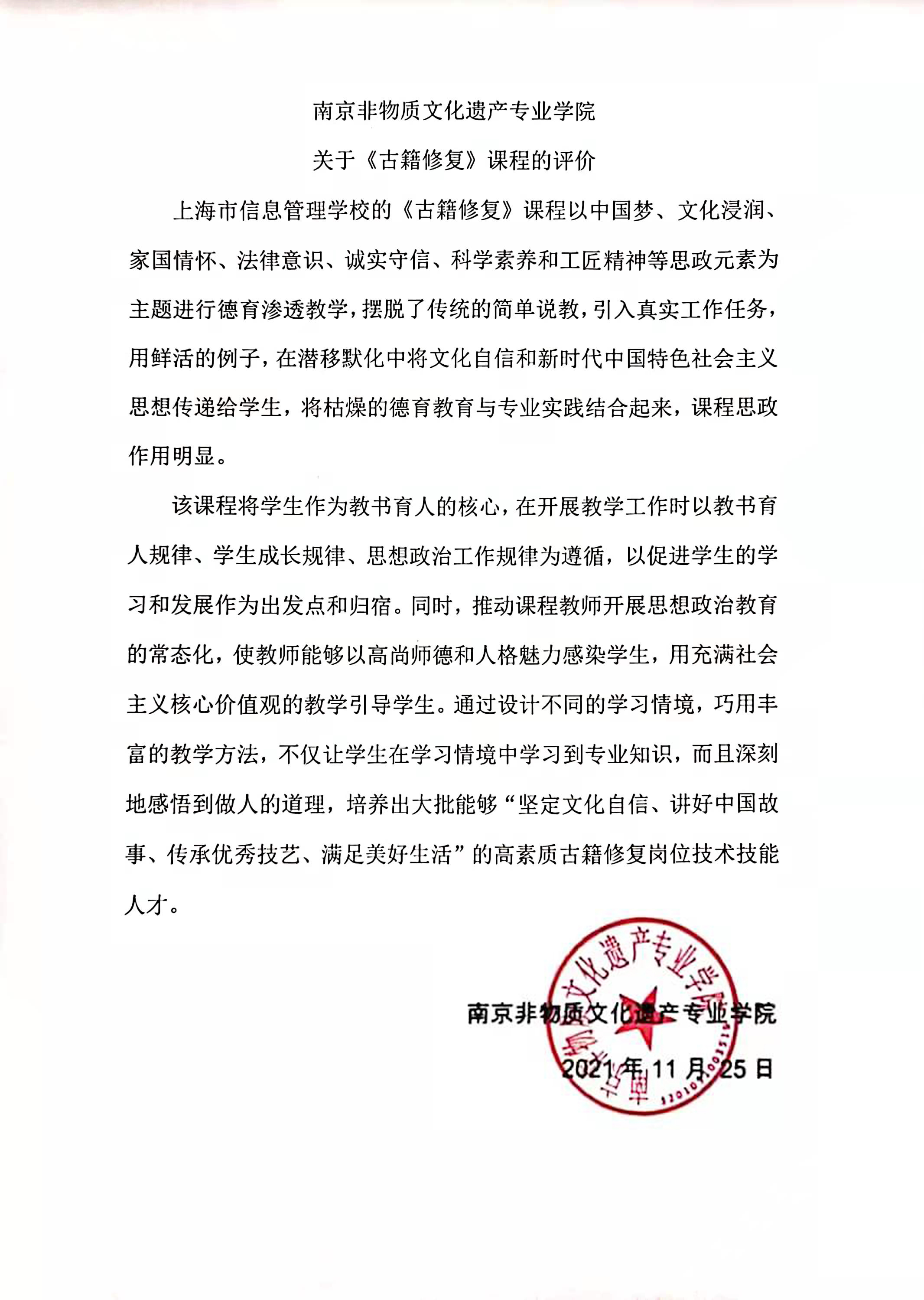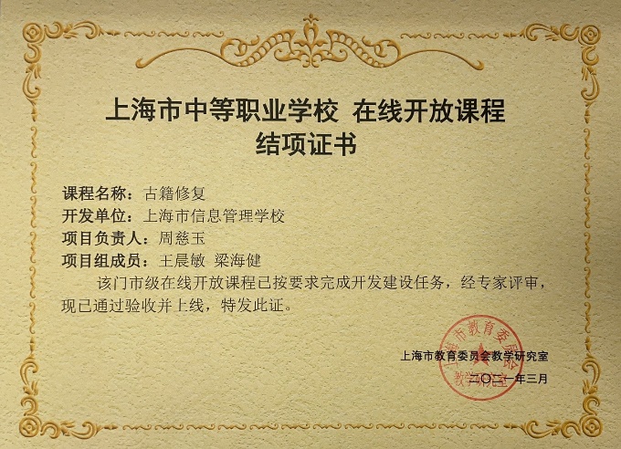 三、教学评价 课程得到政府部门、行业协会、文保企业、兄弟院校的高度评价,南京博物院文保所研究员万俐认为,科学有机融合课程中的各种思政元素,有利的推动了新时代修复人才的培养。该课程学生评价满意度100%,课程教学团队的教学测评位居全校前列。 四、成效辐射 通过本门课程的学习,学生的获得感和成长度得到了大幅度提升,依托课程 思政项目学生获得联合国儿童基金会职业院校青少年可持续发展能力项目、全国最美中职生等国家级奖项 12 次,其中,全国职业院校技能大赛一等奖2 人次;获得上海市各类奖项 316 人次,其中,星光计划技能大赛一等奖 44 人次。对口就业率达 97%,服务 50余家文物修复行业单位。课程成果被国内 5 个院校得到推广,经上海市教委批准,向法国图卢兹 ESM 职业学院推广古籍修复专业课程。