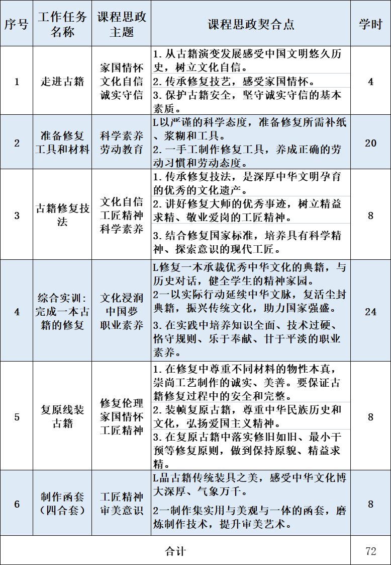 二、课程思政建设目标 在市级在线共享课程的基础上,以习近平新时代中国特色社会主义思想为指导,培育学生理想信念、价值观念、科学精神、团队合作等,构建“浸润式”特色课程思政,落实立德树人根本任务。 三、课程思政内容供给 以“提升文化品质,满足人民美好生活”为主线,围绕政治认同、爱国情怀、实事求是、工匠精神、遵纪守法、健全人格,抓住文化自信和修复伦理两个基本维度,紧扣古籍修复这一核心能力,重点将中国梦、文化浸润、家国情怀、法律意识、诚实守信、科学素养、美育教育、劳动教育和工匠精神等元素融入课程体系设计,实现润物无声的效果。